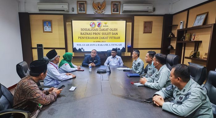 JAVASATU.COM- Kepala Zona Bakamla Tengah Laksma Hanarko Djodi Pamungkas, S.H., menerima Kunjungan dari Badan Amil Zakat Nasional (BAZNAS) Provinsi Sulawesi Utara. Kunjungan tersebut dalam rangka Sosialisasi dan Penyerahan simbolis Zakat Fitrah dari Kepala Zona Bakamla Tengah kepada BAZNAS Provinsi Sulut. Pertemuan ini berlangsung di Kantor Zona Bakamla Tengah, Manado, Sabtu (15/4/2023).