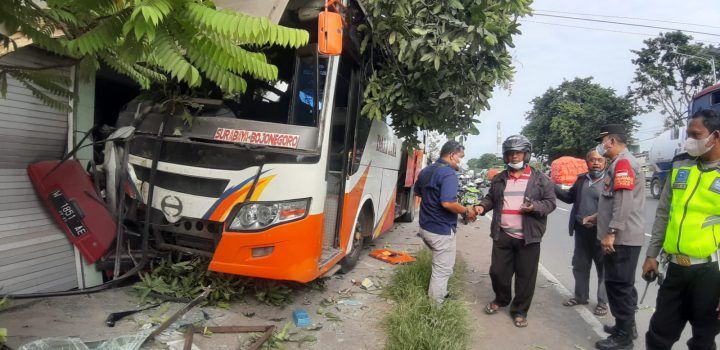 Kecelakaan Oleng ke Kanan, Bus Dali Jaya Mas Sasak Empat Rumah di Duduksampeyan Gresik 3 Februari 2022