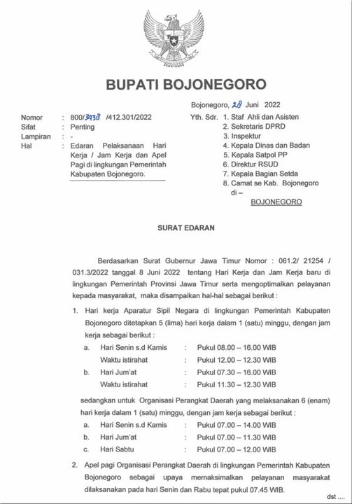 Pemerintah Daerah Optimalkan Kinerja, Ini Hari Kerja Terbaru ASN Bojonegoro Mulai 1 Juli 30 Juni 2022