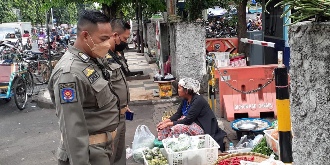 Fasilitas Publik Satpol PP Tertibkan Pedagang yang Berjualan di Trotoar Areal Pasar Baru Gresik 27 Januari 2023