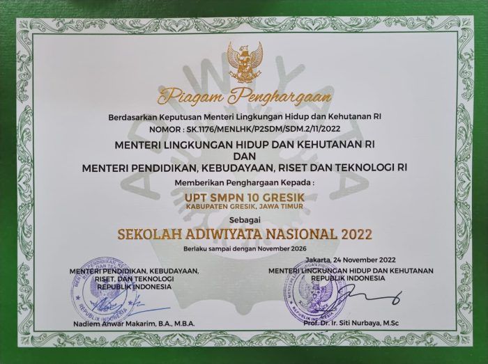 Pendidikan SMP Negeri 10 Gresik Sabet Penghargaan Sekolah Adiwiyata Nasional Tahun 2022 11 Desember 2022